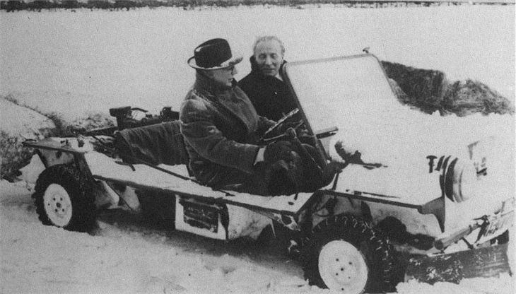 In snow 1ft deep I drove the double-engined Moke today at up to 40mph. Starting in normal first gear we ploughed through the snow, changing up to second and bringing in the rear engine with a flick of the off-side gear lever. Snow flew up on either side in 6ft plumes but the Moke roared forward with complete traction, carrying eight bales of hay. When a 4ft snowdrift brought the car to a halt we put both engines into reverse and cleared the drift in three seconds. Acceleration was as fast and positive as on a dry road and the car can cope easily with a one-in-two gradient. The twin Moke has a power output of 72bhp a top speed of 75mph, and double the pulling power of the standard Mini. It is designed basically as an agricultural and military cross-country vehicle.