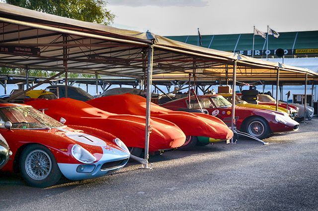 Dawn, and the sun is shining on a day that the weather forecasters were telling us was gong to be a wash-out. That low sun, and the magical cars in the paddock made for a mesmerising combination. Clive Joy's Ferrari 250LM braves the night without a cover, unlike the GTOs behind it.